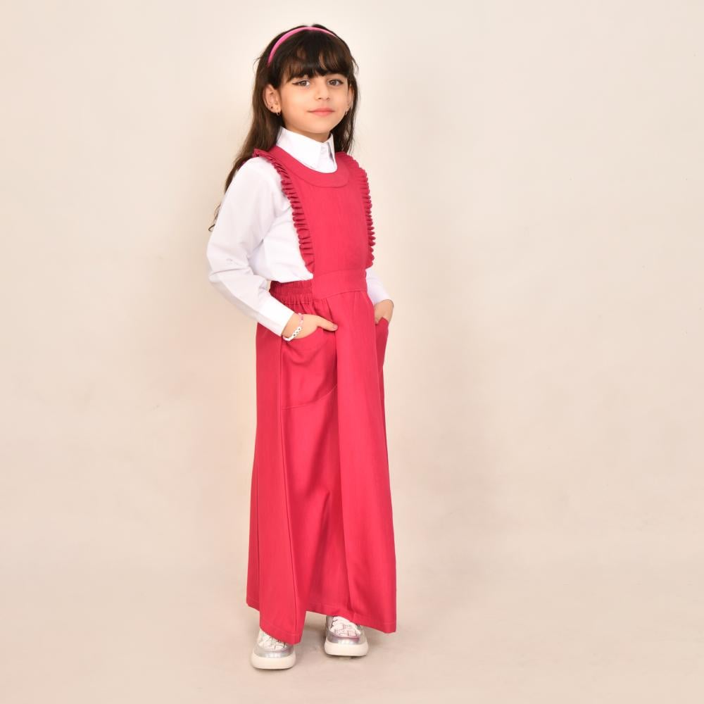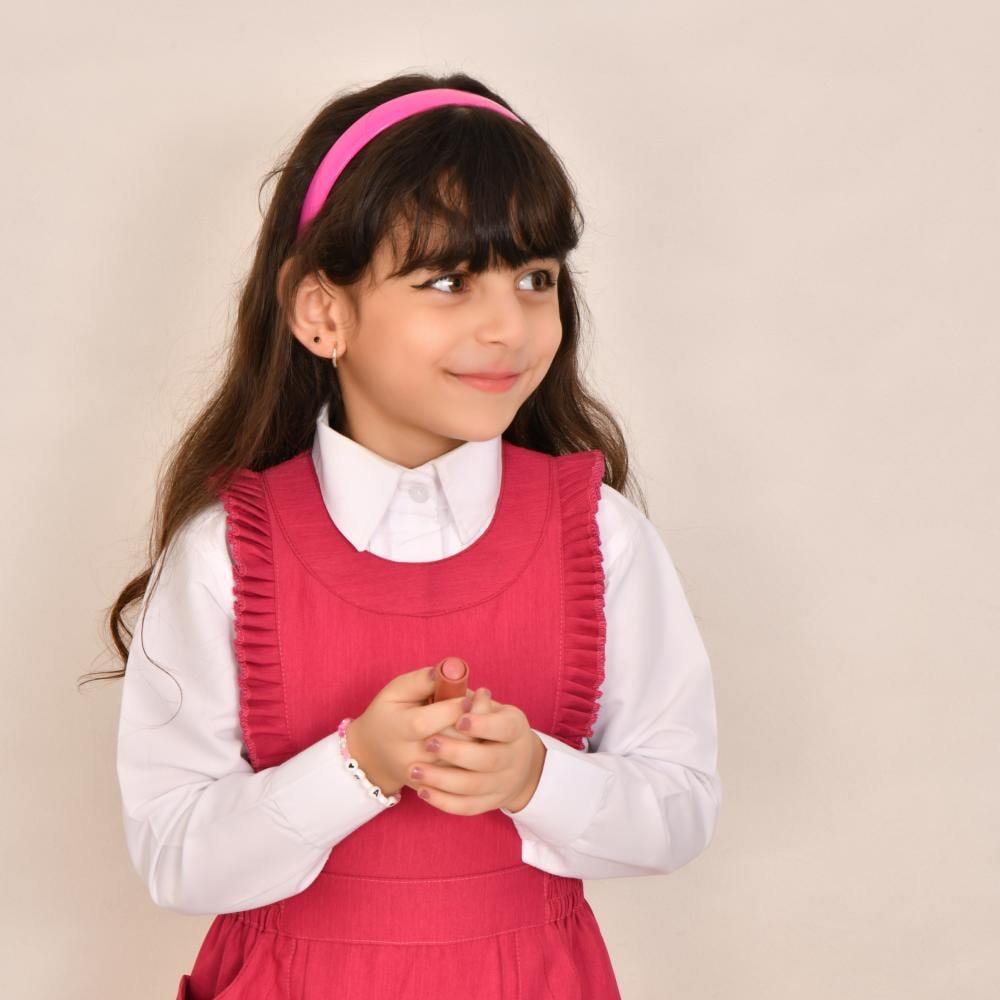 مريول مدرسي ابتدائي باللون الفوشي مزين بكسرات ناعمة وجيوب